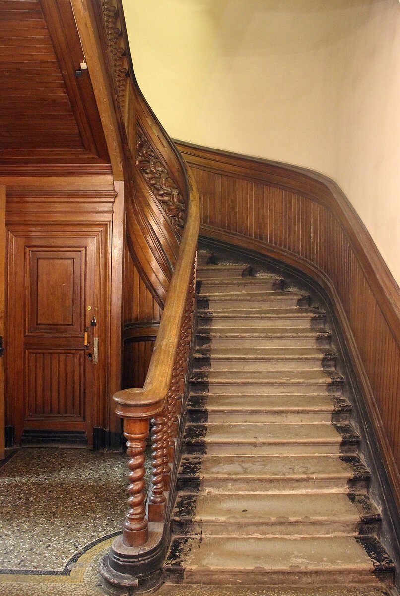 Но более всего меня впечатлила деревянная лестница с витыми балясинами. Так сразу и не вспомнишь, в каком ещё особняке был использован подобный архитектурный приём.