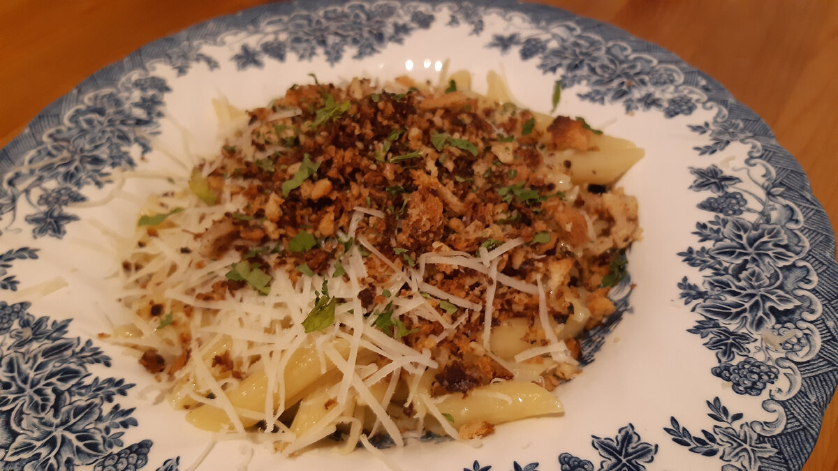 на сковороде в 2-3 ст.л. оливкового масла нагреваете чеснок, порезанный пластинками. Следите, чтобы не сгорел. Потом можно вынуть (я не вынимаю). Отправляете в масло хлебные крошки и смолотые в крошку орехи (не в муку! лучше, когда попадаются крупинки). Все обжариваете до золотистого состояния. Готово!