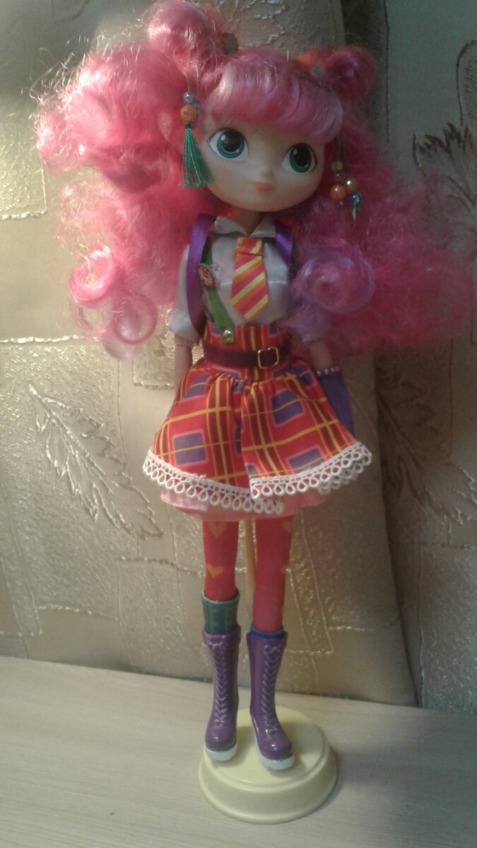 Всем , здравствуйте! Сегодня у нас на обзоре Алиса. Кукла и правдо красивая цена ( по скидке ) небольшая. Брали в ДМ за 1199 рублей. Ну и вот наша красотка! Подставка к сожалению к кукле не прилагается поэтому буду использовать подставку от Маши. ЛИЦО КУКЛЫ И ВОЛОСЫ Лицо у куклы милое. Не такое как у всех остальных. Брови скрыты под чёлкой. Сравните Ещё с хвостиков свисают какоето непонятные бусинки на нитке. Смотрятся красиво но если их не трогать. Дело в том что эти бусины постаянно путаются в волосах. Ну а теперь о волосах! Лысины нет. Есть два пучка ( которые у меня растрепались). К одному пучку прикреплино сердечко. Одежда Кукла одеждой и правдо богата. Одежда : сапоги , колготки,сарафан, боди , перчатка , три браслета. БОДИ К боди ( оно белого цвета ) пришит галстук и значок колледжа. Ткань не очень приятная, грубая не эластичная. Такое чувство что галстук сделан из бумаги! Но вроде ткань. Проверять не буду. Рукова боди сшиты очень не аккуратно. Из них вылезают куски ткани