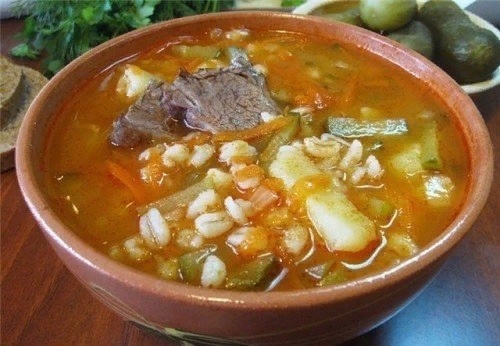 Ингредиенты: - Перловая крупа — 70 г - Картофель — 5-6 шт. - Репчатый лук — 1 шт. - Морковь — 1 шт. - Томатный сок — 50 мл - Соленые огурцы — 5-6 шт. - Огуречный рассол — 100 мл - Соль, зелень — по вкусу Приготовление: 1. За несколько часов до варки, а лучше на ночь замочить перловку. Это улучшит вкус перловой крупы, и сварится она гораздо быстрее. 2. Набухшую перловку залить водой и поставить варить. 3. В это время нарезать кубиками лук. Натереть морковь. Обжарить овощи на растительном масле до мягкости. Добавить сок томатный. 4. Нарезать соломкой огурцы (если огурчики маленькие - можно кружочками). Отправить их в заправку, перемешать и убрать с огня через пару минут. 5. Очистить и нарезать небольшими кубиками картофель. И отправить в бульон с перловкой, варить 10 минут. 6. Затем выкладываем заправку, добавляем огуречный рассол, лавровый лист. Если необходимо, добавить соль, перец, варить еще 5 минут. Готовый рассольник посыпать зеленью и можно подавать на сто