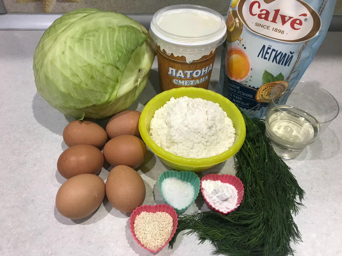 Очень простой в приготовлении пирог. Самое сложное в этом рецепт это постараться потоньше нашинковать капусту. Но сейчас есть приспособления, которые сделают это за вас. Ну а тесто мое любимое - жидкое))) Приступим. Мои продукты для пирога: 1. Капусту разрезала на части, хорошо помыла и нашинковала (делала по старинке, ножом). Посолила и немного обмяла руками. 2. Укроп промыла под струей воды и мелко порубила. 3. Выложила укроп к капусте. 4. Все хорошо перемешала. Начинка готова. 5. Яйца разбила в отдельную глубокую тарелку. Немного взбила венчиком. 6. Затем добавила соль, майонез и сметана. Взбила венчиком до однородности. 7. Далее засыпала муку и разрыхлитель. Перемешала венчиком, чтобы не было комочков. 8. Тесто готово. 9. Противень смазала растительным маслом и выложила капусту по всей поверхности. 10. Равномерно залила капусту тестом и посыпала кунжутом. 11. Духовку разогрела до 180 градусов и убрала туда противень на 30 минут. Готово. У пирога золотистая румяная корочк
