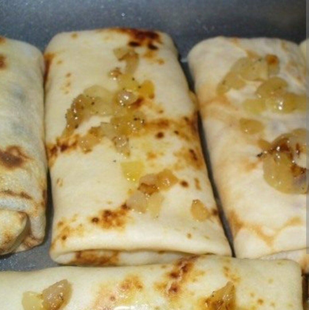 Любите блины но не знаете как разнообразить их наполнение?) Я с вами поделюсь одним из рецептов) Рецепт блинов которые получаются на ура я писала в прошлой статье. Вот именно к тем блинчикам я делаю такую начинку. Ингредиенты. Масло растительное. Селеные огурцы 2-3 шт. Лук репчатый 1шт. Мука 4-5 ст. л. Свиная грудинка 1 шт. Картофельное пюре. Приготовление. Для начала мелко режем лук, засыпаем в него муку и хорошенько смешиваем. Так чтобы каждая луковинка была в муке. Затем на раскалённом масле небольшими порциями обжариваем наш мучной лук до золотого цвета и выкладываем готовый на бумажное полотенце. Полежав несколько минут он станет хрустящим. Именно он вызывает у всех интерес. Так как он получается необычный и вкусный. Пока наш лук остывает режем тонкими ломтиками грудинку и огурцы. Укладываем блинчик на доску. На 1/3 примерно кладём картошку тонким слоем(заворачивать начинку вы можете любым привычным способом),сверху кладём грудинку, затем огурцы. Сверху всё посыпаем лук