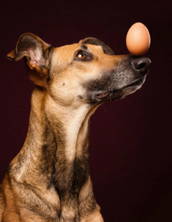 Собака держит яйцо на носу