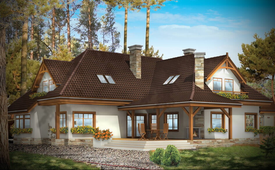 Вход может располагаться со стороны внутреннего двора или с одного из фронтонов. Также он может быть совмещенным с открытой террасой. При этом остекление дома панорамное.