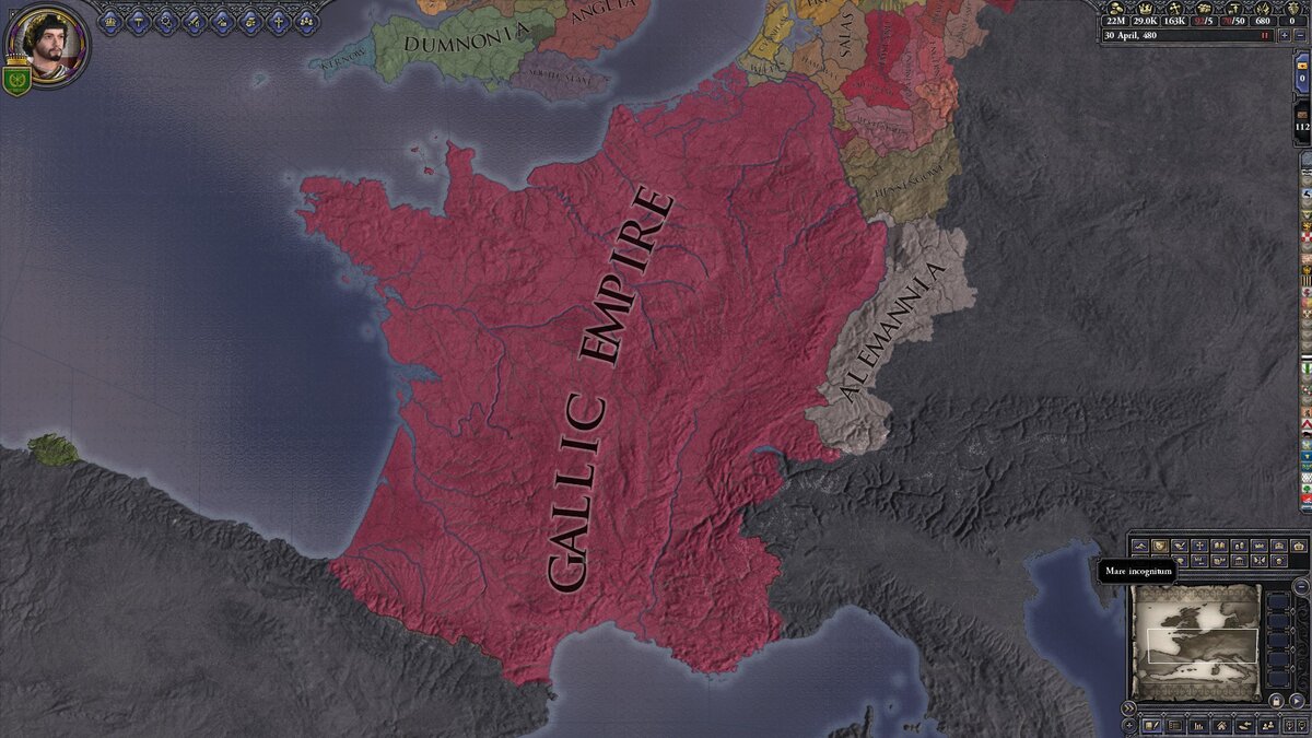 Итак, в 486 году, военный гений Сиагрий полностью уничтожает наступающих франков и гонит их до самого Рейна. Восстановив старую речную границу, следующими под удар попадают алеманны, после них бургунды, после бургундов вестготы и так далее. Одним словом – римское государство в Галлии зачищает провинцию примерно в такой же манере, в какой это сделали франки. Собственно и весь этот сценарий, по сути, замена франков на римлян Сиагрия, но с нюансами.