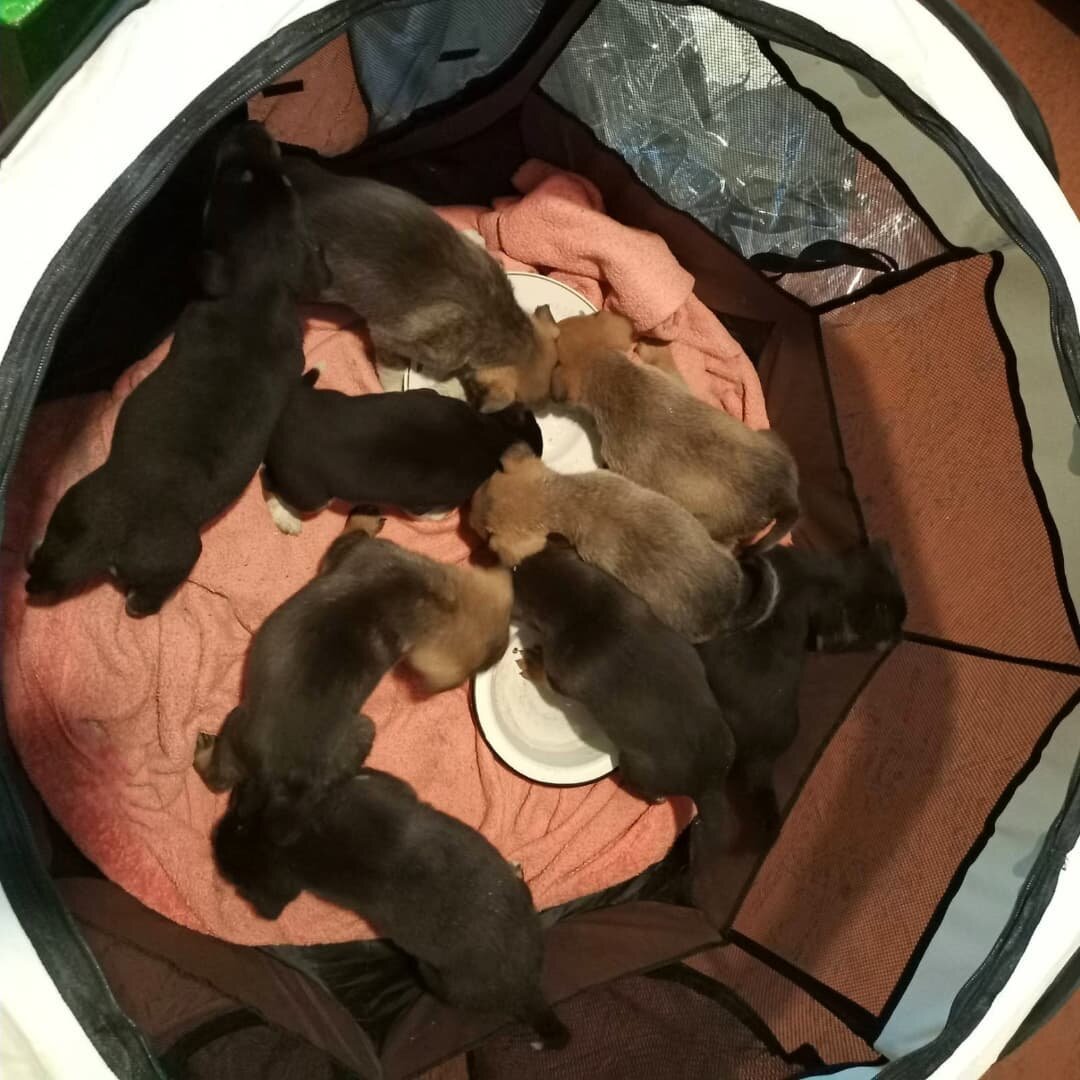 Наши 9 маленьких пополняшек из домашнего мини-приюта "Собаки Семашко". День второй. Одно слово извинений и девять щенков под дверь: неожиданная ситуация в приюте перед проверкой Ну что сказать, немного малышня освоилась. Вчера конечно волонтеру Марине А. страшно было за них, плачут, сбились в кучку, дрожат. Сегодня уже поспокойнее, все активные, кушают хорошо. Детишкам около месяца, 5 девочек и 4 парнишки. Щенки очень ухожены, больных при первом осмотре не обнаружила, все пузатенькие, видно что забота была. Малыши точно не бездомные. Да только легче ли от этого... Даже не задается хозяйка приюта вопросом, не проще ли хозяину было стерилизовать свою собаку, чтобы не доводить до такого. Устала уже от такой страшной обыденности😪 Не красивый это поступок, а для приюта ещё и страшный. И так еле выживаем, у всех хвостов через два дня на третий пустая каша на обед, а теперь ещё пояса сильнее затянуть придется. 9 мордашек и их обычным приютским рационом не накормить. По прежнему остро нуждаем