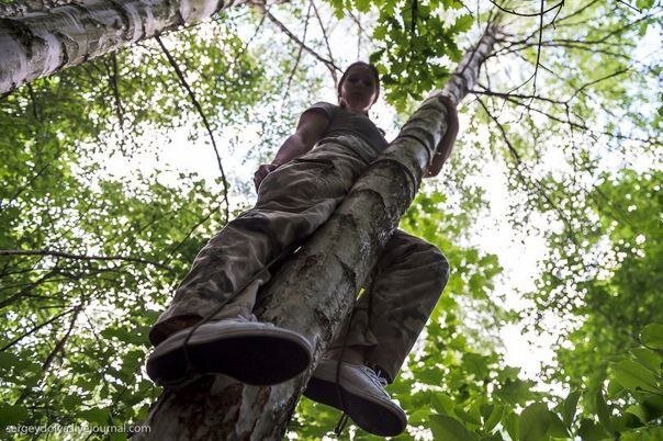 Берем две одинаковые веревки, где-то два метра длиной. Если веревок под рукой нет, то можно использовать несколько шнурков, связанных вместе. Делаем из них 2 самозатягивающихся петли вокруг дерева: А дальше все просто. Залезаем ногами в эти петли. Стоим на одной ноге, а вторую поднимаем. Руками перетаскиваем свободную петлю вверх. Переносим центр тяжести на верхнюю петлю и поднимаемся, как по ступеньке. После этого ослабляем нижнюю петлю и переносим ее вверх: И так, пока не доползете до больших веток или до верхушки.