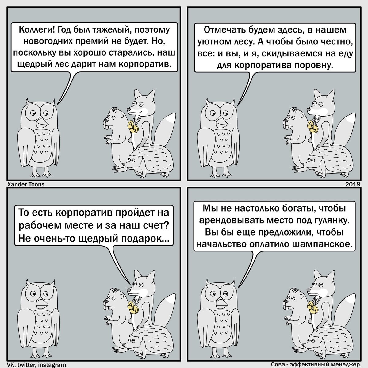 Сова - эффективный менеджер - это серия комиксов за авторством российского иллюстратора Александра Дьякова, также известного как Xandertoons. Комикс рассказывает о типичном офисе, происходящие события в котором хоть и выглядят карикатурно, но зачастую могут быть очень даже близки к реальности. Начальником в том самом офисе выступает очень хитрая Сова, а работники - это разные лесные жители, которым приходится мириться с постоянными выходками своего босса. Как вы могли догадаться, с новогодним корпоративом у главных героев все тоже вышло не совсем гладко.