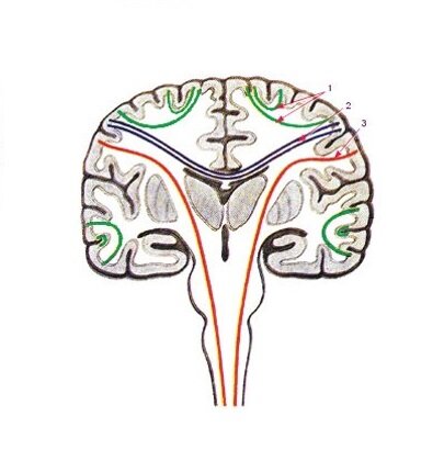 Все волокна белого вещества в больших полушариях мозга можно разделить на 3 группы: первые связывают симметричные участки обоих полушарий, вторые - участки в пределах одного полушария, третьи - большие полушария с нижележащими отделами головного и спинного мозга.