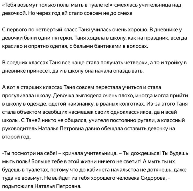 "Тебя возьмут только полы мыть в туалете"-смеялась учительница над девочкой. Но потом ей стало не до смеха.