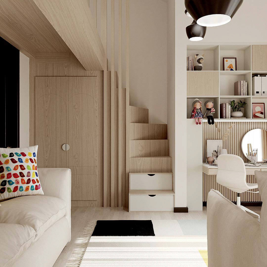 Уютная детская спальня для девочки-школьницы с красивой мебелью. Дизайнерская мебель сделает комнату комфортной и любимой. Подробнее на сайте Ни одна девочка не устоит перед таким великолепным интерьером двухъярусной спальни. Путь на второй этаж начинается рядом с системой хранения – вместительным шкафом для одежды. Дизайнерская мебель украшена натуральным древесным узором. В две первые ступени спиралевидной лестницы интегрированы выдвижные ящики. Девочка сможет хранить тут игрушки, журналы и другие личные вещи. Напротив деревянной лестницы разместился белоснежный диван с плоскими подлокотниками и симпатичными квадратными подушечками. А прямо на подушках удобно устроились мягкие соседи. Мебель для девочки решили протестировать забавные котики с треугольными ушками. Стену над диваном украшают пестрые картины. Второй этаж этой удивительной спальни как будто создан для отдыха и релаксации. На полу разместились большие мягкие подушки, а рядом с ними удобно устроились плюшевые зверята. Тол