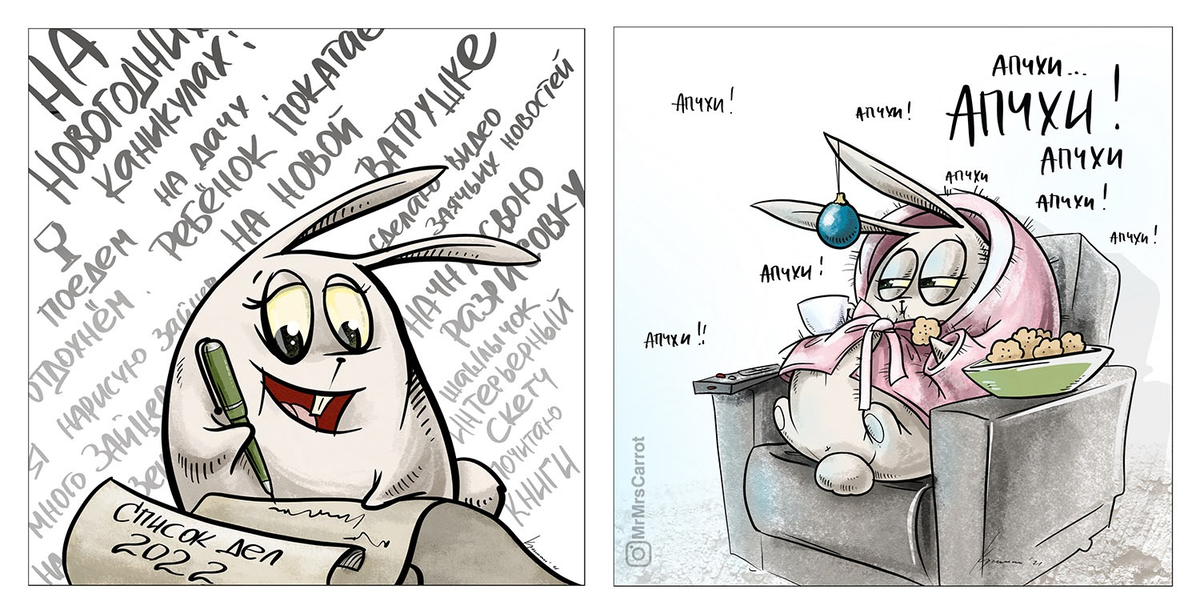 Праздничная неделя скоро подойдет к концу, а это значит, что салаты будут доедены, а уютную домашнюю обстановку придется сменить на интерьер рабочих мест. Конечно же, с волшебной новогодней атмосферой бывает сложно распрощаться и сегодняшние комиксы как раз об этом. За праздники режим успевает сбиться, норма питания измениться в пользу большего количества еды, а желание работать и вовсе совсем улетучивается. Художники комиксов из сети тоже это заметили и решили поделиться своими послепраздничными ощущениями. Надеюсь, что их юмор придется вам по душе. Кстати, всех с наступившим! В рамках серии комиксов Добрые Зайцы от московской художницы Ольги Кресман в конце 2021 года выходил комикс о планах на предстоящую праздничную неделю. Смог ли их исполнить главный герой зарисовки - смотрите ниже. Британская художница Джемма Коррелл (Gemma Correll) настоящий профессионал жанра жизненных комиксов. Оно и не удивительно, за годы творчества она уже успела набить в этом руку. Вот и зарисовка про ново