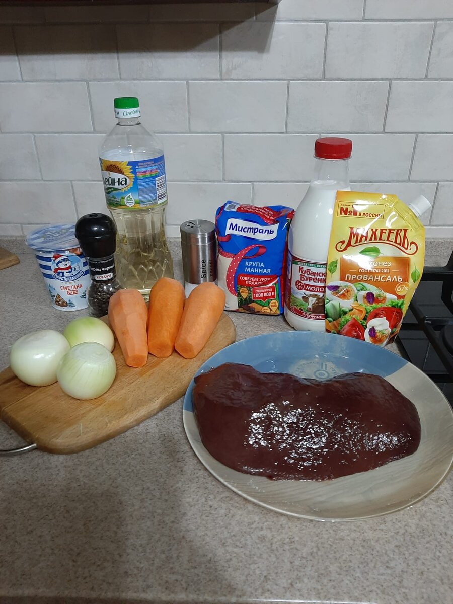 • Печёночный торт приготовленный в духовке. Ингредиенты: - Печень говяжья - 600г - Лук репчатый- 3 шт. - Морковь - 3 шт. - Молоко - 1/2 стакана - Манная крупа - 1/2 стакана - Сметана - 3 ст.л. - Майонез - 3 ст.л. - Перец черный молотый - Соль - Растительное масло Приготовление: 1) Печень моем, очищаем от пленок и измельчаем на блендере (можно на мясорубке). Добавляем манную крупу и молоко. 2) Перемешиваем и ставим в холодильник на 1 час. 3) Обжариваем лук, добавляем немного сахара. Через несколько минут в сковороду отправляем натертую крупно морковь. Солим. Жарим еще несколько минут. 4) Смешиваем сметану с майонезом. Достаем печень из холодильника, добавляем черный перец, соль и перемешиваем. 5) Форму смазываем маслом и выкладываем половину обжаренных овощей, затем половину печени и слой сметаны с майонезом. Потом снова овощи, печень, и верхний слой - сметана с майонезом. 6) Разогреваем духовку до 180' и запекаем 40 минут. Наше блюдо готово! Приятно