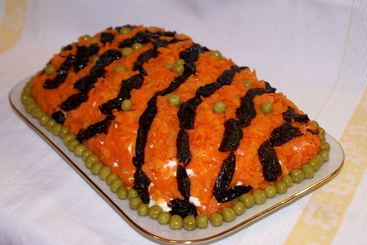 Этот кулинарный шедевр станет украшением любого стола и удивит вкусовые пристрастия каждого гостя. Для приготовления понадобится: 1 – копченая курица или ветчина (300 гр) 2 – картофель (3 шт) 3 – маринованные огурцы (5-6 шт) 4 – яйца (4 шт) 5 – морковь (3 шт) 6 – чернослив (4-5 шт) 7 - консервированный горошек (1 банка) 8 – майонез Картофель, морковь и яйца необходимо отварить и измельчить на мелкой терке, огурцы нарезать. Затем по слоям выкладываем салат: картофель, курица, огурцы, яйца, морковь и каждый ярус слегка смазываем майонезом. В конце нарезаем полосками чернослив и создаем тигровый рисунок, а по периметру украшаем горошком. Вуаля, праздничный салат готов.