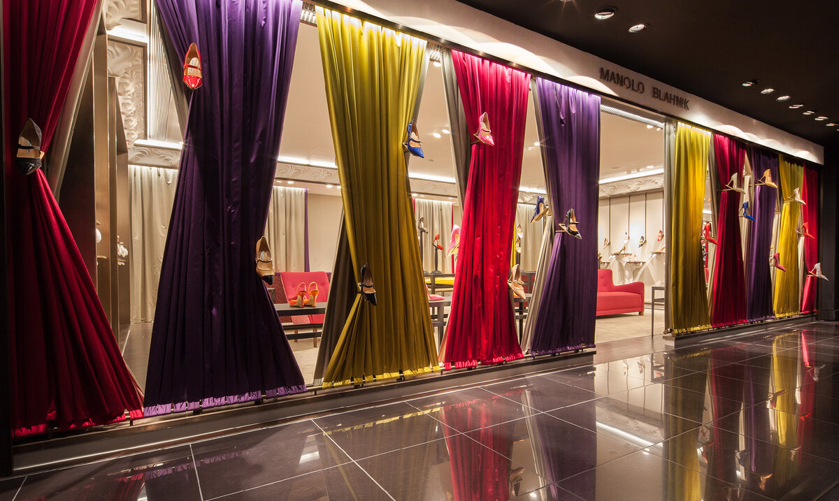 - Модель штор. Универсальное решение — прямые классические шторы. Время от времени вам придется менять декорации и инсталляции, например, при наступлении нового сезона, а такая модель универсальна. Современным магазинам также подойдут тканевые жалюзи, рулонные шторы, японские панели. Французская маркиза и подобные сложные драпировки неплохо смотрятся в антикварных лавках и ювелирных магазинах.