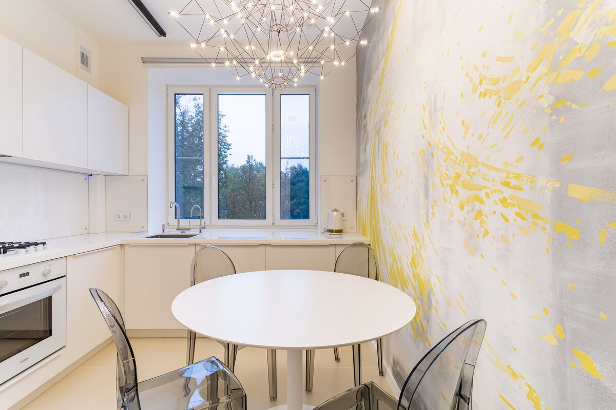 В этом проекте дизайнеру Оксане Цымбаловой с кухней пришлось поработать основательно. Ведь в ней как с ремонтом, так и с организацией пространства большие проблемы. Поэтому помимо нового интерьера в кухне запланировали рабочую зону вдоль двух стен и новые вместительные системы хранения. А еще мойку решено переставить к окну, а стол сделать круглым. Потолок стал белым, а на одной из стен появилась яркая абстракция. Сочные брызги буквально вырвались из-под кисти художницы Марианны Яковлевой. На кухне появился новый кухонный гарнитур, выполненный из качественной ЛДСП, которая тоже к нам приехала из Сыктывкара. Шкафчики внутри ярко-желтого цвета, а снаружи – белые. В качестве материала для столешницы выбрали белоснежный акриловый камень Грандекс. Он не боится ни влаги, ни бытовой химии. И в уходе он совсем неприхотлив. Прозрачное закаленное стекло стало простым и практичным решением для фартука на кухне и прекрасно вписалось в концепцию дизайнера. Двухметровый холодильник несмотря на свой