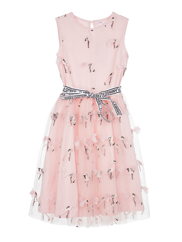 ● розовое платье с сеткой и принтом фламинго.