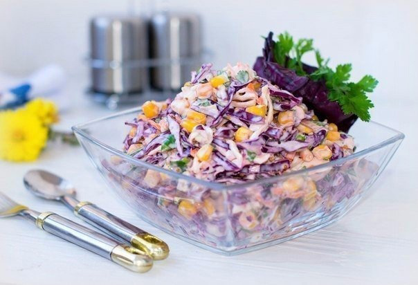 «Коулсло» — это салат на основе самого европейского овоща капусты. Он невероятно популярен не только в Европе, но и в США, где практически в каждой семье имеют свой вариант этого салата. Итого на 100 грамм 38 ккал Б/Ж/У 2 / 0.5 / 7.2 Ингредиенты: Капуста краснокочанная — 1 маленький кочан 300 г Капуста белокочанная — 1 маленький кочан 300 г Морковь — 2 шт. средние Кукуруза консервированная — 1 банка Петрушка — 1 пучок Йогурт или сметана — 100 г Уксус яблочный — 1 ст. л. Соль — 0,5 ч. л. Горчица дижонская — 1 ст. л. Перец черный молотый — по вкусу Процесс приготовления: 1. Белокочанную капусту мелко нашинковать. Размять руками. Морковь почистить и натереть на крупной терке. 2. Краснокочанную капусту мелко нашинковать, удаляя жесткие части (прожилки). Хорошо размять руками, чтобы она стала мягче и пустила сок. Зелень петрушки порезать. 3. Из консервированной кукурузы слить жидкость. 4. Смешать все ингредиенты. Полить заправкой и снова аккуратно смешать. 5. С