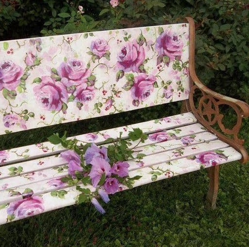 Сад не должен быть скучным. Вы должны придать ему интересный вид, соответствующий личности владельца. Если мы любим свой сад и нас обуревают идеи, не стоит их подавлять, а заняться украшением садовой скамейки, превратив обычный предмет мебели в выразительный. Что нужно, чтобы украсить скамейку с помощью декупажа? Наилучший эффект будет достигнут на деревянной скамье, не покрытой никакими украшениями или красками. После того как вы купили или выкопали ее из глубин гаража, переходите к нанесению белой краски на верхнюю и нижнюю части скамейки. Это послужит основой для нашей дальнейшей работы. Когда белая краска высохнет, покройте нижнюю часть скамейки синей краской. В течение времени, необходимого для высыхания скамейки, не будем терять времени, начнем вырезать цветы из салфеток. Для собственного удобства, чтобы не тратить драгоценные минуты и не расстраиваться, лучше купить салфетки с крупными цветами - подсолнухами или розами. Удалите из срезанных цветов среднюю, белую и более толстую