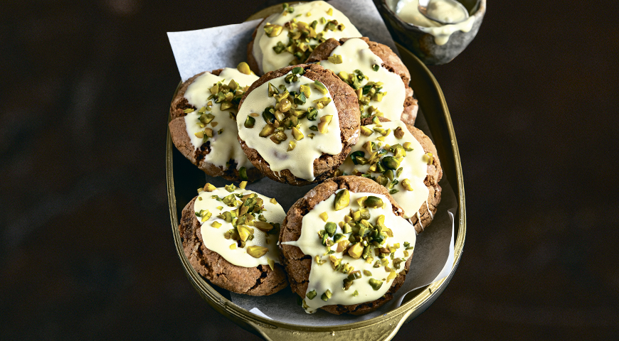 ИНГРЕДИЕНТЫ Для посыпки: Для шоколадной глазури: ПОШАГОВЫЙ РЕЦЕПТ ПРИГОТОВЛЕНИЯ Шаг 1 Поместите сливочное масло в небольшой ковшик и нагревайте на среднем огне, пока масло полностью не расплавится. Продолжайте нагревать масло, постоянно взбивая венчиком, еще 2–3 мин. За это время масло приобретет золотистый цвет и ярко выраженный аромат. Снимите с огня и немного остудите. Шаг 2 Соедините в миске муку с крахмалом, молотым имбирем, какао, содой и солью и тщательно перемешайте. В остывшее сливочное масло добавьте яйцо, коричневый сахар и ванильный сахар, перемешайте миксером. Всыпьте сухую смесь, замесите тесто и уберите на 15 мин в холодильник. Шаг 3 Застелите противень бумагой для выпечки. Разогрейте духовку до 180 °C. Отделите столовой ложкой порции теста и скатайте шарики. Обваляйте в сахарной пудре и разложите на противне на расстоянии не менее 2 см друг от друга. Выпекайте на среднем уровне духовки в течение 10–12 мин. Переложите на решетку и остудите. Шаг 4 Наломайте белый шоколад