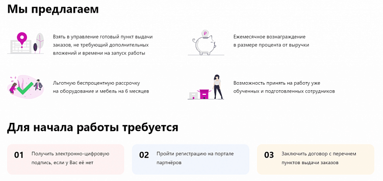 Вы можете взять под управление уже готовый офис выдачи товаров или новый после его открытия в вашем населенном пункте. То есть это не привычная нам всем франшиза, когда вы покупаете бизнес и управляете им самостоятельно.