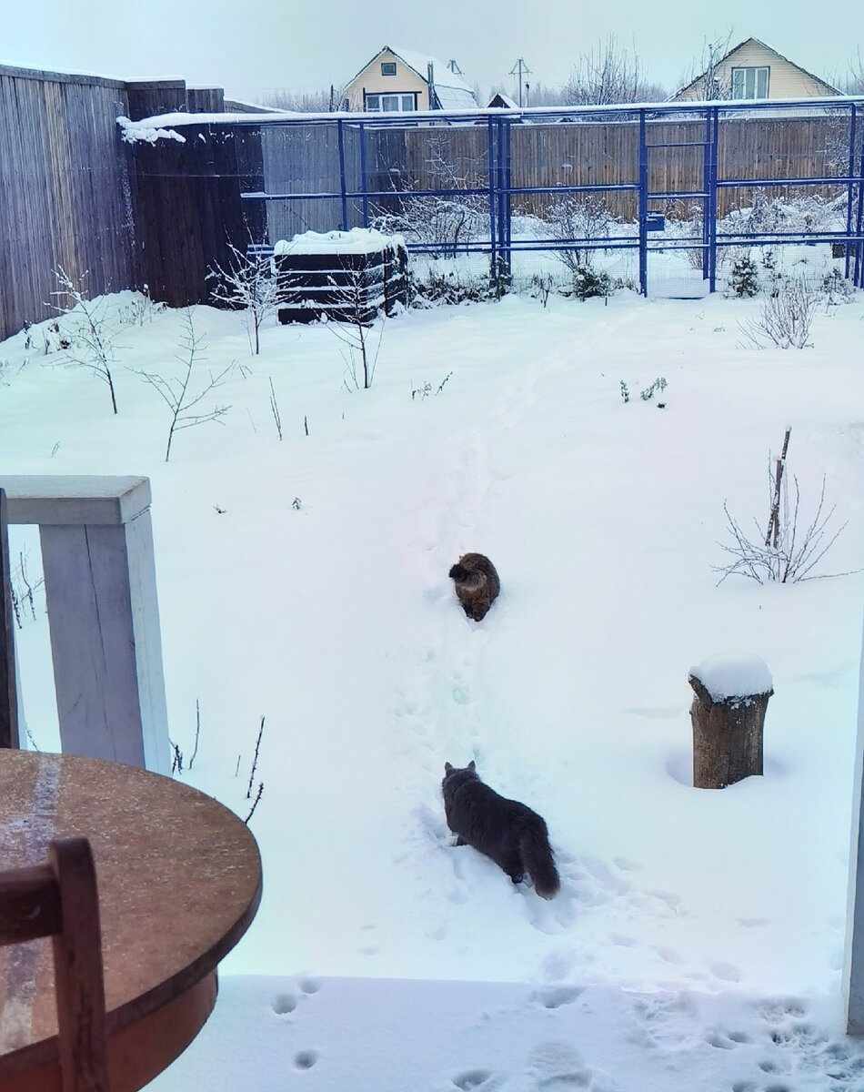 У нас выпал пушистый снег и пушистые коты вышли играть.