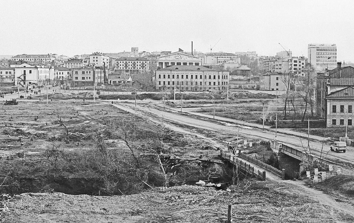 В левой стороне фотографии видно светлое трехэтажное здание с пожарной лестницей на торцовой стене. Узнаете ресторан «Волга»? Именно оттуда два месяца назад были сняты предыдущие фотографии. Многое исчезло за это короткое время, но на территории будущего залива еще оставалось трехэтажное здание Верховного суда и, рядом с ним, дом бывшего дворянского собрания. Об их судьбе поговорим в следующий раз, а пока обратим внимание на трехэтажное здание в центре фотографии, за которым виден фронтон Муздрамтеатра. Вот что писала «Трудовая газета» (с 1929 года — «Красная Чувашия», с 1952 года — «Советская Чувашия») в феврале 1926 года: «По средине города Чебоксар Чувашреспублики стоит каменное белое здание бывшей духовной семинарии. В этой школе буржуазия готовила не одну сотню попов, для затемнения и эксплуатации крестьянства» и продолжала: «Октябрь 1917 года смел это гнездо невежества. Советская власть вместо него построила «Советско-партийную школу», для подготовки культурных работников в отста