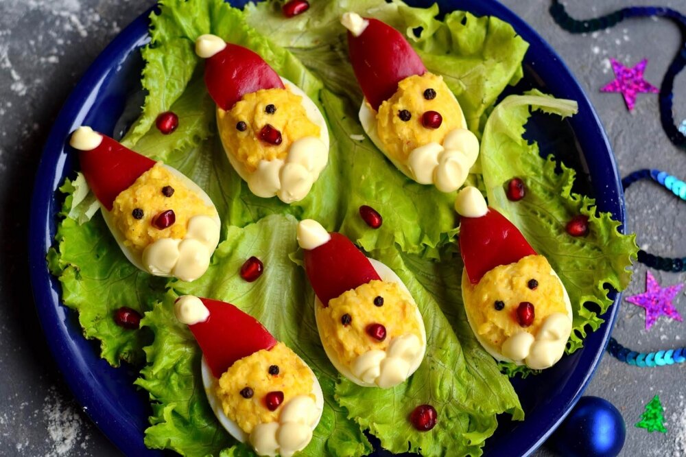 Предлагаем рецепт интересной закуски — «Дед Мороз» из фаршированных яиц. Готовится блюдо быстро и просто, очень нравится маленьким детям. В качестве начинки можно использовать самые разные ингредиенты — сыр, грибы, рыбные консервы и так далее.