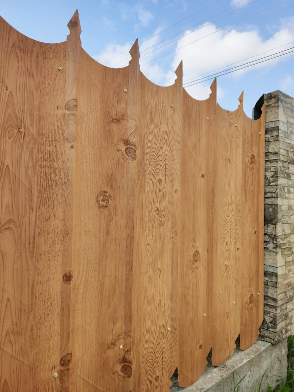 Нижняя часть профиля тоже имеет оригинальную форму, что не только придает изделию законченный вид, но и позволяет визуально скрывать особенности рельефа, и обеспечивать вентиляцию ограждения без опасности проникновения животных и птиц на участок. При фотоофсетном покрытие листа (производства Южной Кореи) забор становится негорючим, что исключает переход на Ваш участок низового пожара.