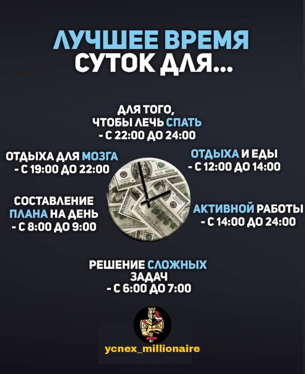 Готовиться с вечера «Подготовка – ключ к успеху», - Александр Белл Бизнесмены не дожидаются утра, чтобы распланировать свой день. Они привыкли опережать события, как минимум на 8 часов. По вечерам успешные люди отключают свои мобильные девайсы, размышляют, читают и составляют перечень задач на будущее. Ввести ежедневный утренний ритуал Наличие утренних ритуалов, отточенных до автоматизма, - характерная особенность успешных людей. К числу ежедневных процедур, которые можно возвести в ранг привычки, относятся: медитация, чтение деловой литературы и журналов, физические упражнения, составление приоритетного плана, визуализацию целей и, конечно же, питательный завтрак. Упростить быт Бизнесмены давно усвоили, что лишь немногие жизненные решения на самом деле важны. Они не заморачиваются в чем идти в спортзал, что есть на завтрак и не стоят часами у стеллажей с шампунями в супермаркетах, скрупулезно вычитывая этикетки. Отбросив бытовые мелочи, вы освободите уйму времени на полезные занятия.