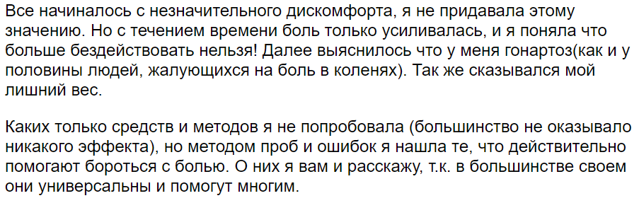 Делюсь опытом. Как я забыла, про б0ль в коленях, придерживаясь важному принципу. Который мне посоветовал врач