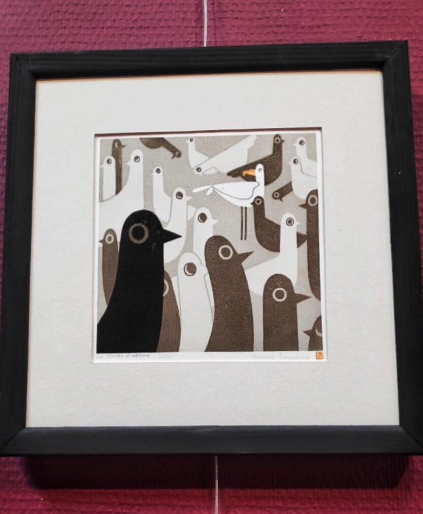Николай: Да, в основном на выставке представлены работы морской тематики. Море, вода, Владивосток. Всё это представлено в технике гравюры. С 2019 года мы с моей девушкой начали арендовать мастерскую и стали более плотно заниматься творчеством. Возможно, выставка случилась бы намного раньше, если бы и мастерская появилась пораньше. Но вот плотная работа с 2019 года позволила мне создать необходимое количество работ, чтобы заполнить выставочное пространство, показать что-то зрителям.