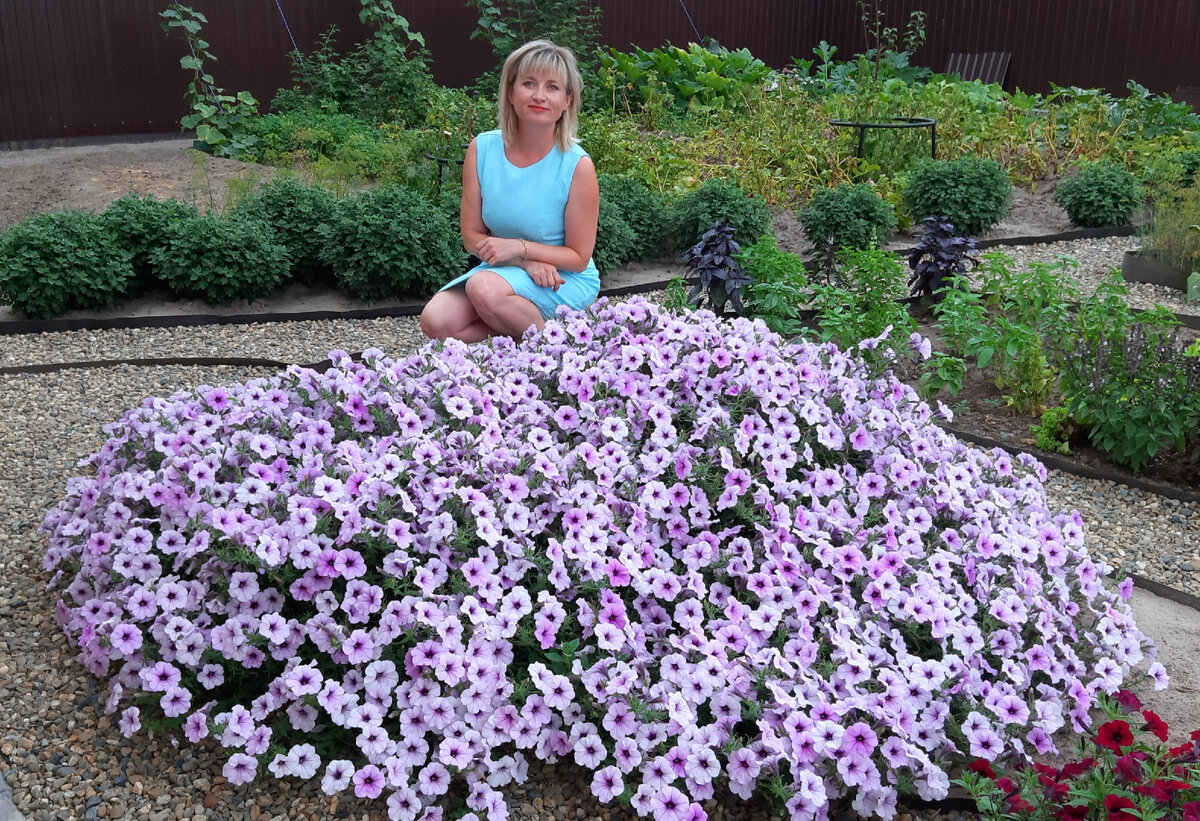 Меня постоянно спрашивают читатели – сколько цветов посажено в этой клумбе? ОДИН! Это – один цветок, который, разрастаясь, превращается в огромную клумбу. Каждая ветка цветка способна вырасти от 1,5 длиной! И даже больше! Этот гигантский красавец – Сильвер. Петунии тайдалы. Они - шикарное украшение любого пространства. Капризны, как и любые аристократы, требуют постоянного ухода и соблюдения ряда правил. Иначе откажутся показать себя во всей красе. Я сажаю Сильвера рассадой весной, когда закончатся заморозки. В начале своего пути он совсем маленький и сложно поверить, что со временем вырастет такое цветущее чудо. И с другого ракурса та же клумба: Для бурного роста этим цветам нужно солнце, полив и подкормки. Без подкормок цветок не вырастет таких размеров и не станет постоянно цвести. Поливаем строго под корень! Нельзя лить из шланга! Нельзя попадать водой на бутоны! Нельзя холодную воду – только отстоявшуюся и теплую. Я поливаю из лейки. Точно знаю – где корень и осторожно раздвига