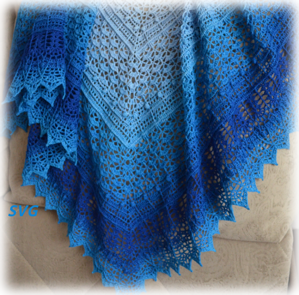Описание и схемы составлены так, как вязала я. Если что-то непонятно, я готова помочь. 5 дней в неделю по будням я с Вами. Пряжа хлопок градиент ROSEGARDEN 1000/250 расход 310 г Крючок № 3 Точный размер после ВТО 186 х 87 Шаль вяжется сверху вниз от середины. Начать можно удобным для Вас способом, связав цепочку из 5-6 воздушных петель и замкнуть в кольцо, или использовать скользящую петлю. На схемах половина шали, вторую половину вяжем симметрично В начале каждого ряда первый ССН заменяем на 3 петли подъема Вторая, третья и четвертая секции основаны на этом узоре с заменой на рельефные столбики Как вязать поп-корн в изнаночных рядах, можно посмотреть здесь Вот так выглядит первая секция с узором Вторая секция вяжется аналогично, за исключением средней линии. В 35 ряду три рельефных столбика должны располагаться над поп-корном из предыдущей секции, средний из трех Третья секция Кайма. В последнем ряду присутствует полустолбик с накидом, я забыла отметить в тетради. После стирки и