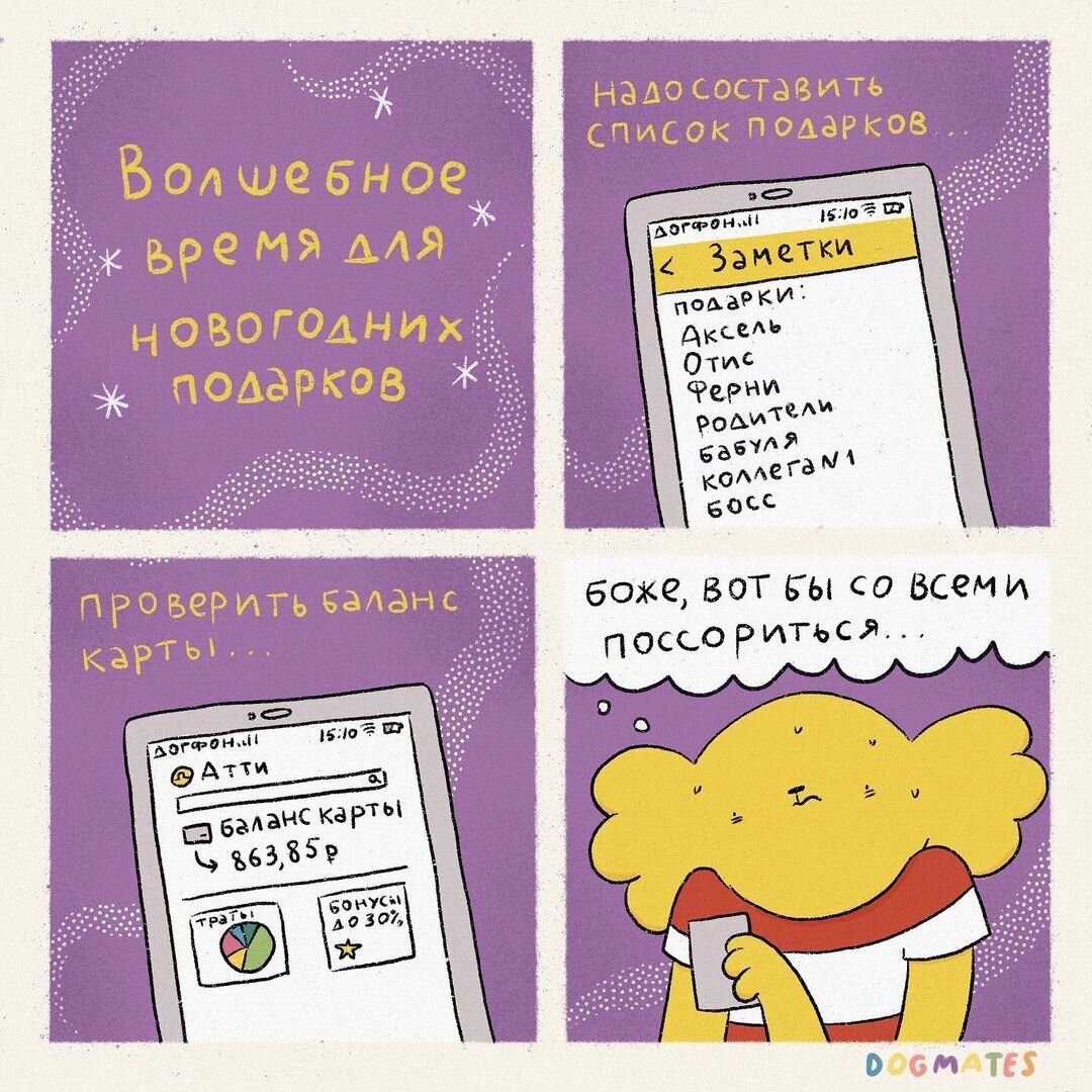 Ну что, признавайтесь, успели уже получить какие-нибудь подарки? Если даже и нет, то конечно же, еще все впереди, потому что Новый год только через пару дней. Само собой, в такую предпраздничную пору количество новогодних и рождественских комиксов в сети просто зашкаливает. И да, многие из них посвящены теме подарков: что купить, как завернуть, каким образом преподнести и все в таком духе. Как обычно я постарался выбрать для вас все самое лучшее по заданной тематике. Надеюсь, что вам понравится. Ну и да, всех с наступающим! Серия комиксов Пёсьи друзья (Dogmates) от художницы по имени Майя (maya.karakuli) рассказывает о желтом антропоморфном песике по имени Атти, который живет самой обычной жизнью, любит посидеть дома и поесть чего-нибудь вкусненькое. А еще у Атти полно друзей, которым нужно подарить подарки на Новый год. Возможно, даже больше, чем нужно... Американский художник Зак Стаффорд (Zach Stafford) - автор серии комиксов Extra Fabulous Comics («Экстра-невероятные комиксы») - из
