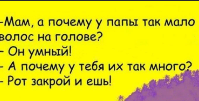 Анекдот 1 Муж хочет бросить жену, мол не красивая. Жена говорит: — Я пойду по улице, а ты иди за мной, если на меня никто не оглянется — бросай, а если кто—то оглянется — будем жить вместе. Муж удивился — на его жену смотрели все! Даже машины притормаживали! Ну брак не распался. У них появилось двое детей. В 60 лет жена признается: — Дорогой, я им всем язык показывала… Анекдот 2 Он: »Сделай бутерброд». Она делает. Он съедает. Он:»А можно еще?» Она: »Нет. Это была демо—версия заботливой женщины. Лицензию вы сможете приобрести после регистрации брака.»