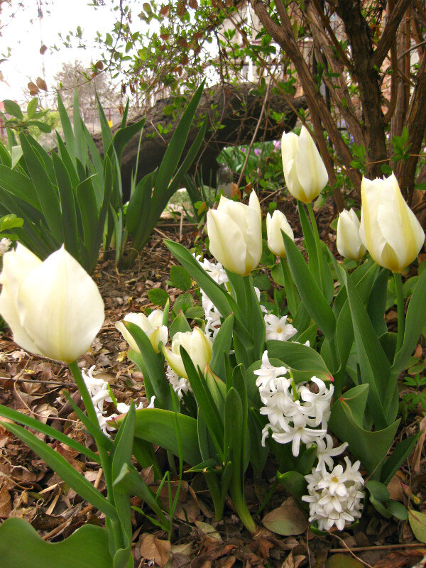Приходилось ли вам наблюдать, как после выкопки и просушки луковиц тюльпанов истлевали, превращались в прах самые лучшие, самые отборные из них, не дожив даже до осенней посадки? Как бесследно пропадали посаженные осенью в землю красивые, здоровые луковицы — они просто не всходили весной. А приходилось ли вам наблюдать противоположное явление: обнаружить весной потерянные или выброшенные луковицы гиацинтов, нарциссов, тюльпанов — порой ссохшиеся, и совсем невзрачные, но живые — с проклюнувшимся росточком зеленовато-желтого цвета? Но однажды у меня произошло кое-что еще более удивительное. Однажды в одном из не очень приметных уголков своего сада я обнаружила растущий букет белых гиацинтов и тюльпанов. За деревьями, под кустом жимолости Стендиша, видимые лишь только, если подойти к ним сзади. В таком месте я точно не могла их посадить! И все же - они там красовались. Я смотрела на них, недоумевая, как они там оказались, мучительно пытаясь припомнить, какое бредовое состояние сподвигло