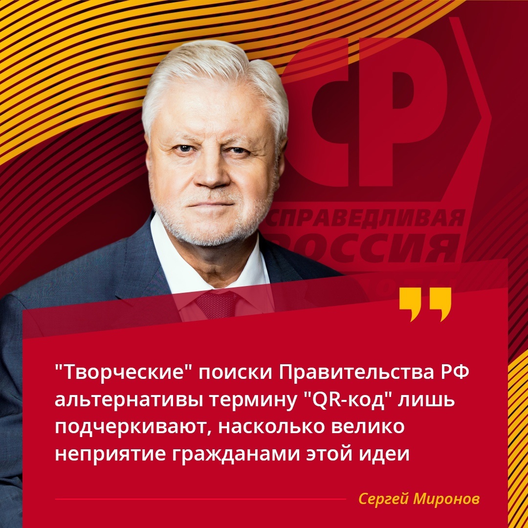 Власти обсуждают варианты названия документа для привитых и переболевших СOVID. При этом использование термина «QR-код» планируется свести к минимуму, так как более 50% россиян воспринимают его через призму ограничения свобод. С помощью социологических исследований тестируются разные варианты — «паспорт здоровья», «сертификат здоровья», «зеленый паспорт» (Green pass), «ковипасс», «санитарный паспорт» и другие. Финальное название документа может быть закреплено официально поправками ко второму чтению законопроектов о QR-кодах или документом оперштаба по борьбе с коронавирусом. Сергей Миронов убежден в том, что любое название документа, который вводит ограничения для граждан, связанные с вакцинацией, не изменит ни его антиконституционной сути, ни отрицательного отношения к нему большинства россиян. Если бы власти предложили что-нибудь нужное людям, предложили что-нибудь дать, а не в очередной раз отнять, никаких проблем с названием не возникло бы.