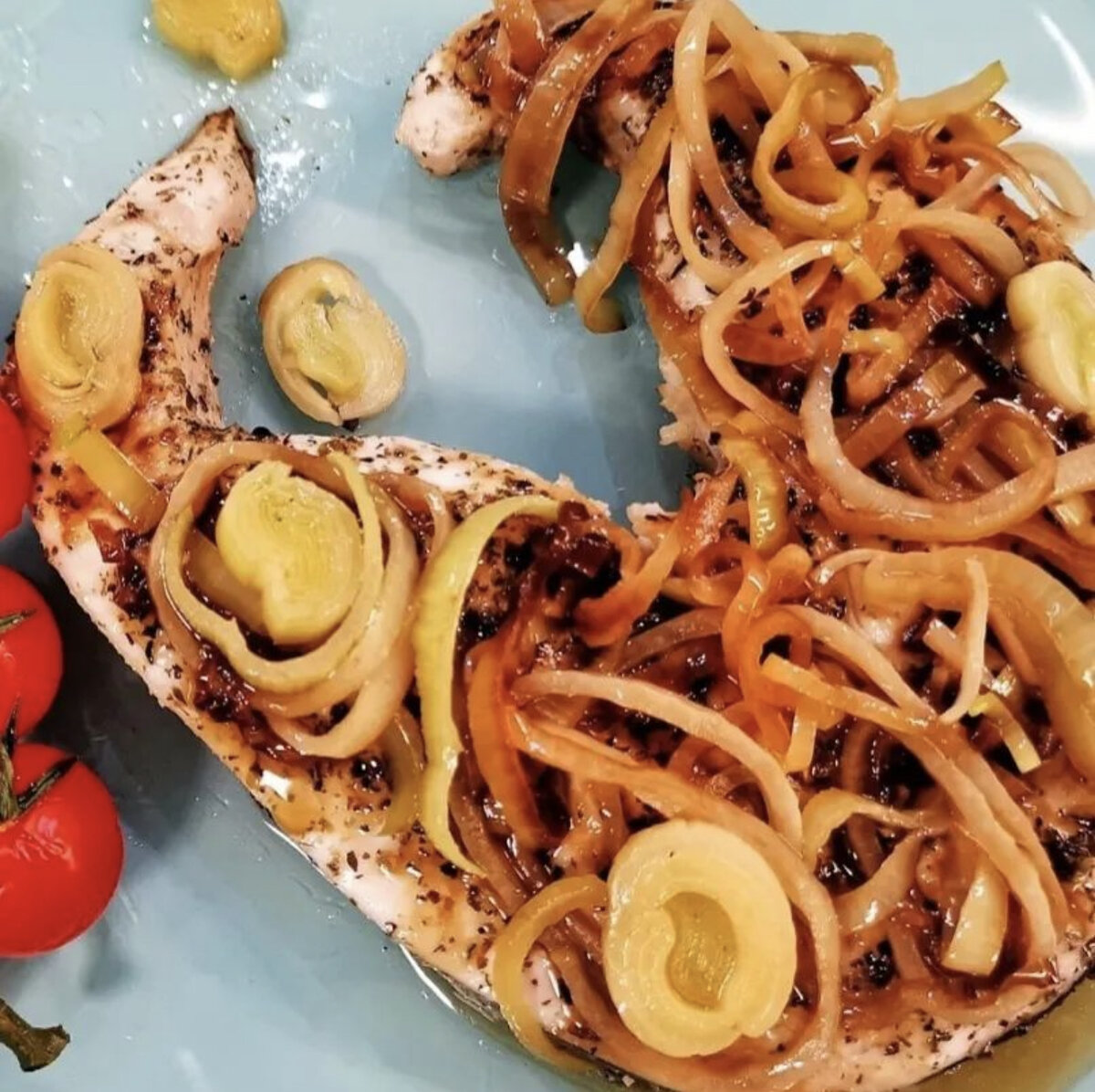 Рецепт стейка из осетра с луком-пореем, тушенным в вине.