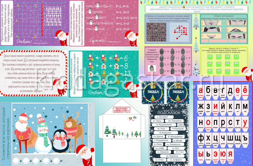 Сценарий квеста с готовыми карточками-заданиями на Новый год для детей - это отличный способ нестандартно подарить подарки ребятам и весело провести время. ⛄ Сценарий квеста с готовыми карточками-заданиями на Новый год для детей - это отличный способ нестандартно подарить подарки ребятам и весело провести время. А поскольку квест включает элементы шпионского квеста (фоторобот, отпечатки пальцев, шифровки...), успех гарантирован. Готовый сценарий новогоднего квеста состоит из ✅карточек с заданиями для самостоятельного проведения, ✅макета конвертов для заданий и ✅инструкции по проведению. После приобретения сценария новогоднего квеста в класс вам останется только распечатать карточки, вырезать, спрятать в тайниках и подготовить подарки. Проведение квеста не требует особых умений и организаторских способностей. А подготовка займёт не более 30-40 минут. Квест на Новый год в класс подразумевает и классный кабинет, и большое количество детей. Сценарий квеста "Новогодняя миссия" создан специ