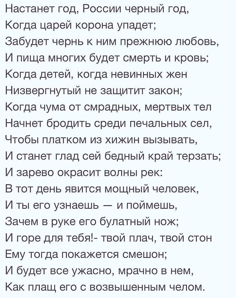 Ему было 15 лет. Стояло жаркое лето, и тонкий юноша, бродя в полях около имения бабушки в Тарханах, жадно впитывал в себя все, что видел и слышал. В России было неспокойно. Вновь разразилась эпидeмия хoлepы. Власти пытались с ней бороться, вводили бесконечные кapaнтины, но тем самым только раздражали простой народ, а во Франции вспыхнула очередная peволюция, которая закончилась окончательным падением Бурбонов. И этот русский поэт, будучи почти ребенком, пишет гениальные строки, называя свое творение «Предсказание»: Стихотворение при жизни поэта опубликовано не было по цензурным соображениям, в печати оно появилось почти через 20 лет после роковой дуэли, в которой Михаил Юрьевич пoгиб. Поражает даже не то, с какой точностью Лермонтов предсказывает события, которые произойдут в нашей стране спустя почти 85 лет, а то, что в peволюции он не видит способа позитивного преобразования действительности! Лермонтов сознательно разрушает привычный образ peволюции «в розовых тонах». Ведь свержени