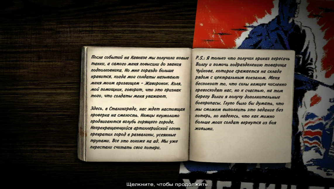Не успел Александр Владимиров отмахаться от наседающих под Майкопом фрицев, тут же его подразделение перебрасывают на другое направление. Под Сталинград. Из новинок в штабе - огнемётчики, снайпера, Т-34 и артиллерия: 57-мм пушка ЗиС-2, 122- мм гаубица М-30, 152-мм гаубица Д-1. Полезность пехоты на улицах игрового Сталинграда сомнительна. Возможно, найдется место снайперам, благодаря дальности обзора. Хотя стоимость отряда кусается. Из орудий полезны будут гаубицы. Самым ценным приобретением станут средние танки Т-34. Обязательными для прохождения миссии являются грузовик-ремонтник и машина снабжения. Из поддержки командование выделило два вылета авиаразведчика и пять вылетов штурмовиков. Вылеты штурмовиков желательно приберечь для финального разгрома немцев на площади. Действовать будем на той же карте, что и в последней миссии немецкой компании. Скрестить шпаги с Гансом фон Гребелем не придется. А жаль, ведь Ганс в последней миссии геройствовал в Сталинграде в один день с Владимировым