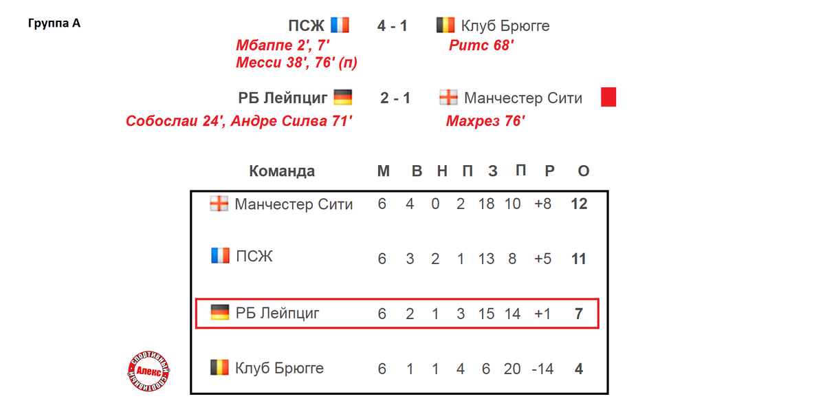 Кто вышел в плей-офф Лиги Чемпионов после 6 тура? Начнём обзор с группы «А», где осталось определить обладателя 3-го места. ПСЖ не сумел победить Брюгге в первом круге. Второй матч завершился крупной победой парижан 4:1. Лейпциг и Манчестер Сити в первой игре забили 9 мячей на двоих (3-6). В итоговой таблице ничего не изменилось. Манчестер Сити и ПСЖ сыграют в играх на вылет Лиги Чемпионов. Лейпциг остался третьим и отправляется в 1/16 финала Лиги Европы, а Бельгия теряет своё лучший клуб Брюгге. Парижский клуб был основан всего 50 лет назад, а Манчестер Сити около 140 лет, о чём мы рассуждали в одном из последних выпусках. Милан уступил в первой игре Ливерпулю 2:3. «Красные» выиграли и второй матч со счетом 2:1. Англичане победили в своем 6-м матче подряд. Милан после 3-х побед потерпел первое фиаско. Порту крупно уступил чемпиону Испании Атлетико 1:3. Напомню, в предыдущем противостоянии 2013 года сильнее были индейцы. Антуан Гризманн записал гол + пас. У Порту первое поражение на