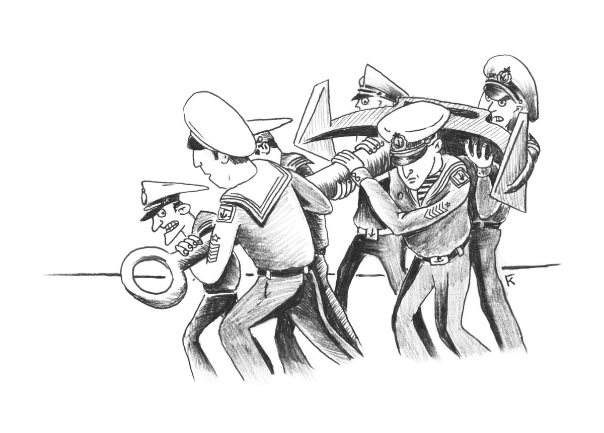 Именно из-за этой самой верности погожим мартовским вечером некоторые женатики с нашего курса не пошли по домам, а остались ночевать в казарме. Но при чём тут март, если выпуск в июне? – спросите вы. И тут ответ очевиден: нам просто не повезло с яйцами! Ввиду того, что нигде поблизости подходящих не наблюдалось, а небольшой золотистого цвета, стоящий в сквере между штабом и клубом вождь мирового пролетариата был лишён своих ещё на стадии проектирования, у нас было принято вытаскивать один из двух якорей Холла, украшавших газон факультетского скверика, со своего привычного места на плац. И делалось это за сто дней до выпуска, то есть в марте, поскольку тащить тяжеленную железяку в полтора центнера весом по снегу куда логичней, нежели по асфальту.