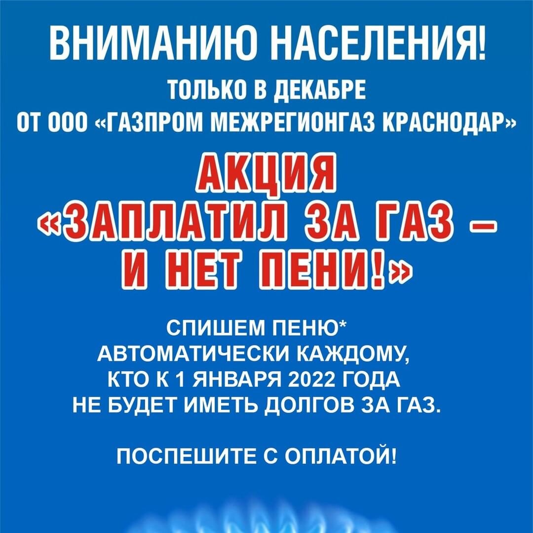 С 1 декабря для жителей Краснодарского края стартовала предновогодняя акция от ООО «Газпром межрегионгаз Краснодар» «Заплатил за газ – и нет пени!». По условиям акции всем абонентам, успевшим погасить свои долги за газ в полном объеме с 1 по 31 декабря 2021 года, требования по оплате пени будут прекращены.