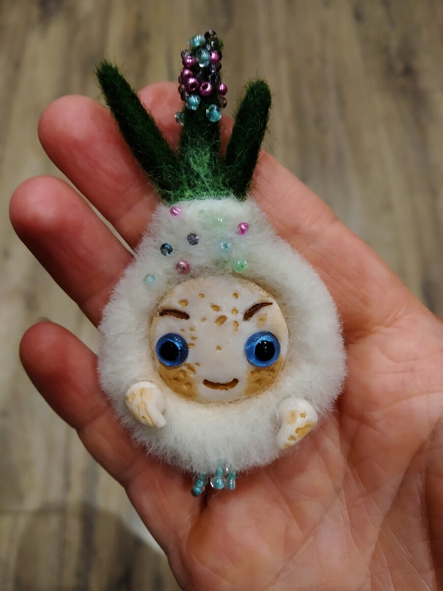 Из шерсти можно сделать множество полезных и красивых вещей, таких как одежда, игрушки и даже брошки. Одежду делают в технике мокрое валяние, ну а броши и игрушки в технике сухое валяние. Сейчас аксессуары из шерсти становятся все популярнее среди молодежи. Брошки в виде овощей - малышей смотрятся очень мило. Одну из таких мы будем делать сегодня. А именно валяную брошь из шерсти «Лучок». Всем знакомый персонаж из сказки «Приключения Чиполлино». Нам потребуется подготовить необходимые для работы материалы: Свою работу мы начнем с лепки личика. Хорошенько размягчите в руках пластику и вылепите сначала шарик, из него сделайте лепешку. На ней прорисуйте спицей или острой деревянной палочкой черты лица и вставьте глазки. Слепите миниатюрные лапки. Отправляем глину на варку в кастрюлю. Время варки 4 – 5 минут после закипания воды. Слейте воду и дайте остыть глине. Далее начинаем процесс валяния тела лучка. Возьмите белую шерсть и сваляйте плоскую деталь высотой около 1 - 1,5 см. В ней сд