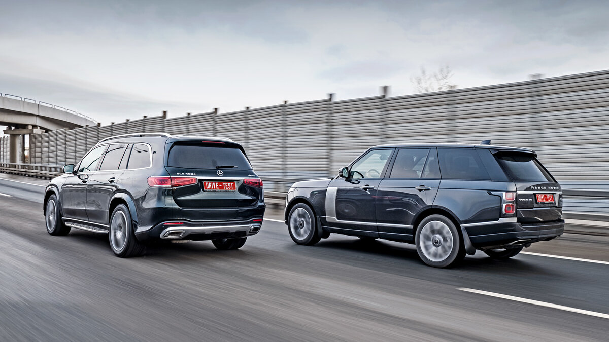 В том числе свобода выбора дороги. Только Vogue в нашей классификации относится к внедорожникам, несмотря на несущий кузов. Здесь помимо общей для участников теста пневмы есть понижающая передача и электронноуправляемые блокировки двух дифференциалов. А эти ходы подвесок! Впрочем, я забегаю вперёд... Даже в зеркале заднего вида Range Rover смотрится наиболее представительно. Его ни с чем не спутаешь. А новый GLS в общих чертах изрядно смахивает на младший ГЛЕ, хотя решётка и оптика у флагмана свои.