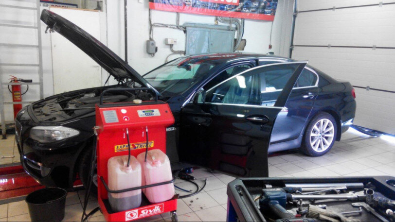 Ситуация значительно усугубляется при использовании специальной станции для замены масла в АКПП. Аппарат подключается к магистралям коробки и прокачивает контур под давлением: старая АТФ замещается новой. В этом случае к химическому фактору удаления отложений добавляется механический: под напором вековая грязь отходит от поверхностей АКПП ещё более охотно.