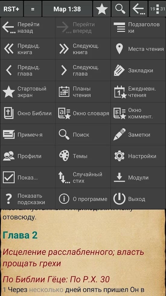 - Озвучивание (TTS): текст Библии, комментарии, словарные статьи, ежедневные чтения, даже автоматическое комбинирование озвучивания текста Библии и комментариев к нему (может пригодиться в долгой дороге за рулем).