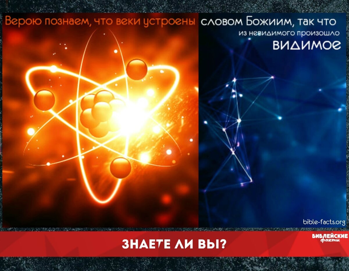 📖 Знаете ли вы? 📘 - Возможно, вы удивитесь, узнав, что Библия — это довольно подробный астрономический текст. Некоторые библейские персонажи, такие как Иов, Давид и Авраам, обладали феноменальным пониманием космоса — пониманием, коренящимся в Божьем откровении. И во многих отношениях Библия опередила научные открытия на тысячелетия. 📕 - «Верою познаем, что веки устроены словом Божиим, так что из невидимого произошло видимое» (Евр.11:3). 📘 - Материя состоит из невидимых атомов, которые в плотном соотношении становятся видимы. (Открыто в 20-м веке). ► Больше интересных Библейских Фактов ► Библейские факты сайт